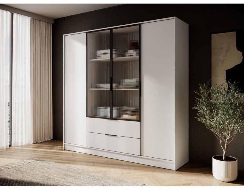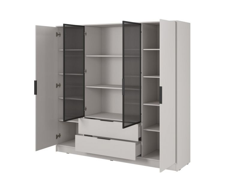 Этот 4-дверный шкаф оснащен центральной прозрачной дверцей, что позволяет вам с легкостью просматривать содержимое, не открывая все двери. Дополнительные полки обеспечивают максимальную организацию пространства, позволяя хранить одежду, обувь и аксессуары в порядке. Больше не нужно тратить время на поиски нужных вещей – все будет под рукой!