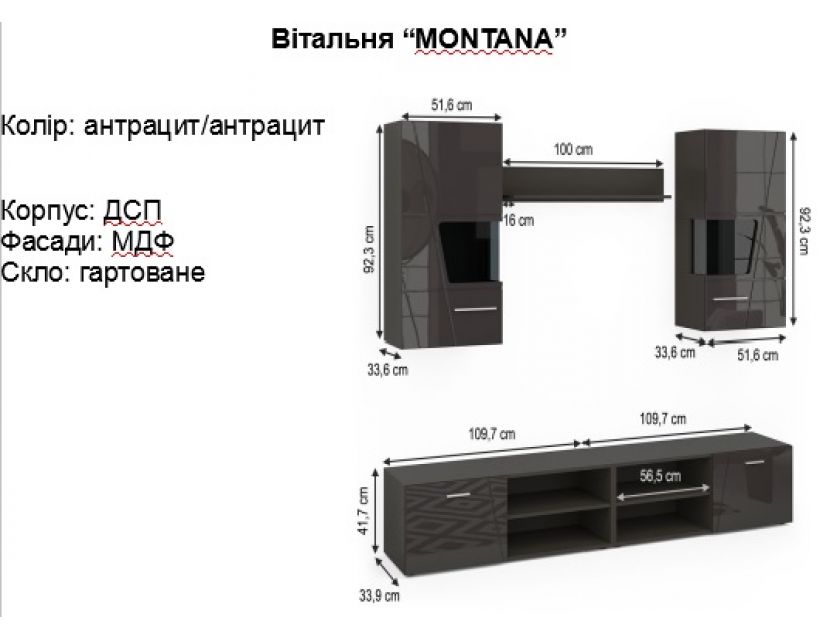 Гостиная Montana (Монтана) антрацит Сокме выполнена из эко-плиты ДСП ламинированной, фасады выполнены из МДФ. Гостиная впечатляет стильным, инновационным дизайном. Эта гостиная станет украшением вашей комнаты.