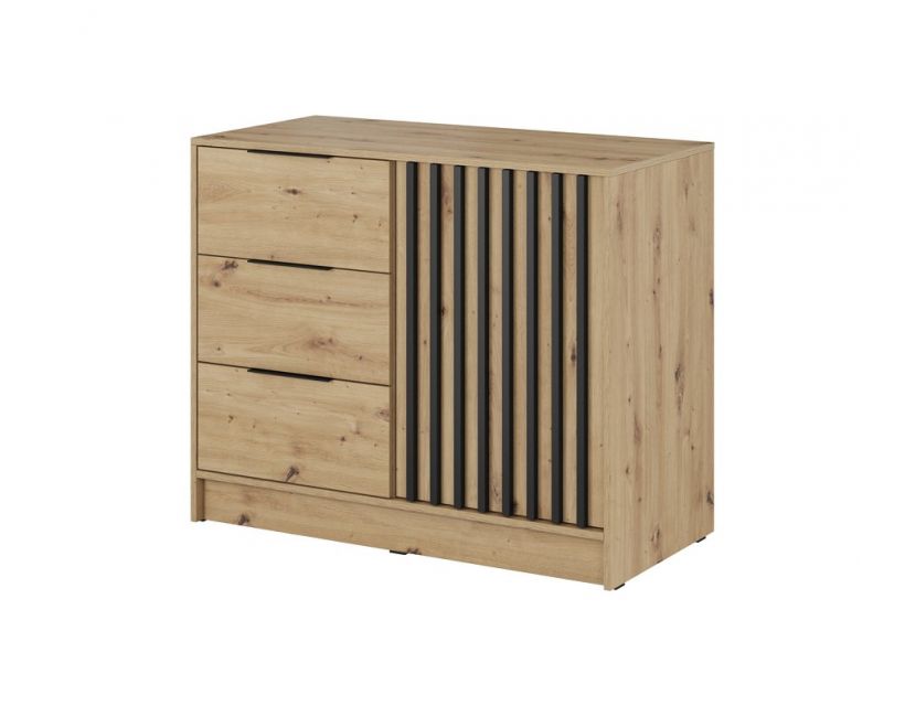 Комод оборудован одной дверью и тремя просторными ящиками, что обеспечивает удобное хранение ваших вещей. Вы сможете легко организовать свое пространство, сохраняя в нем все необходимое. Разумная планировка внутреннего пространства позволяет использовать комод не только для хранения одежды, но и для аксессуаров, документов или даже игрушек.