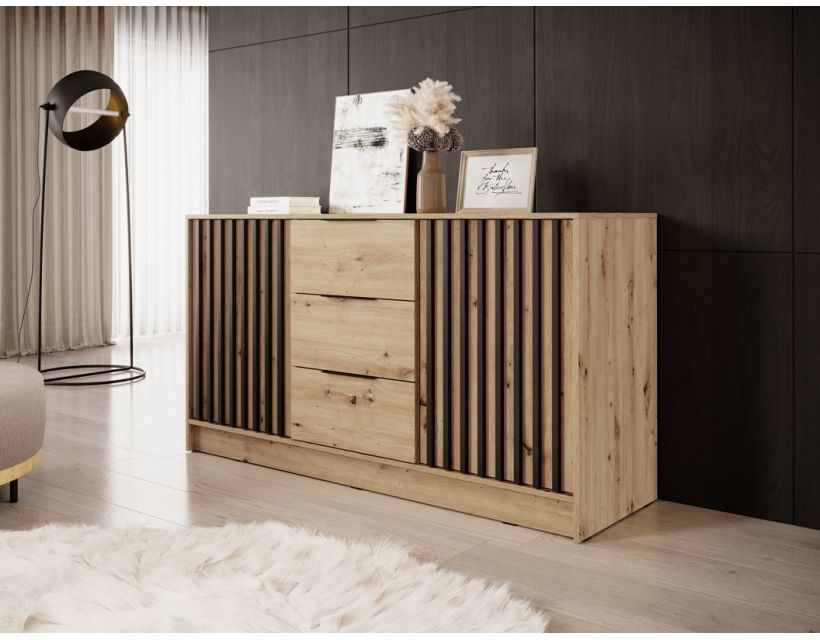 Ищете идеальное решение для хранения вещей, которое дополнит интерьер вашего дома? Комод Perfect Home Нелли – это то, что вам нужно! Его современный дизайн в сочетании с цветовой гаммой дуб артизан и черного создает элегантный вид, который легко впишется в любой стиль. Благодаря 2 дверцам и 3 ящикам, вы сможете удобно организовать свое пространство, сохраняя порядок и комфорт.