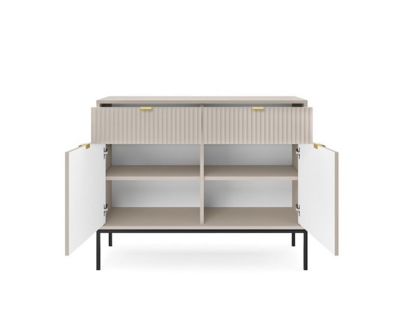 Комод оснащен двумя просторами для хранения с дверцей и двумя ящиками, что позволяет удобно организовать ваши вещи. Черные ножки придают ему стойкость и изысканность, создавая впечатление легкости и стиля. Вы сможете легко достать все необходимое, не жертвуя эстетикой вашего пространства.