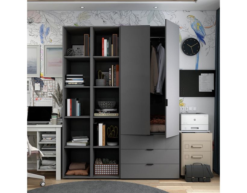 Откройте для себя элегантность и практичность комплекта шкафов для одежды Doros Гелар. Этот современный набор, состоящий из трех шкафов, идеально впишется в любой интерьер, придавая ему изысканность. Благодаря продуманному дизайну и графитовому цвету эти шкафы не только обеспечивают достаточно места для хранения, но и становятся стильным акцентом в вашей комнате.