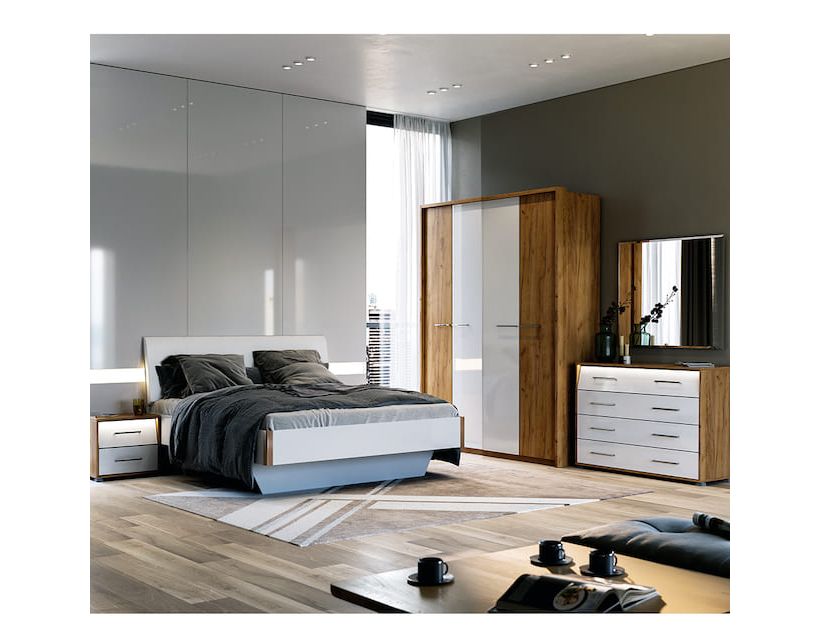 | Цвет | Корпус - Дуб крафт; Фасад: Дуб крафт - Белый глянец; Корпус кровати: Дуб крафт - Глянец белый; Цвет ткани: светло-серый |