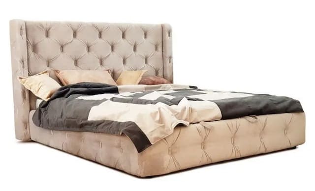 Кровать с мягкой обивкой и высоким изголовьем. В качестве основы спального места используется подъемный металлический каркас с ортопедическими буковыми ламелями (расстояние между ламелями 2,5 см.). Каркас приподнимается вверх от изножья на 60° при помощи пневматического подъемного механизма на газовых амортизаторах, что обеспечивает доступ к объемному бельевому ящику. Подъемный механизм работает очень плавно, бесшумно и выдерживает большие нагрузки.