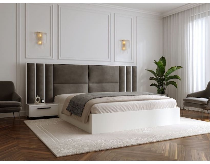 Кровать Монарх — королевский акцент в современной спальне. Высокое мягкое изголовье с глубокими вертикальными вставками создает поразительный акцент на стене. Гармонично дополняется двумя подвесными тумбами в тон кровати – это не просто мебель, а цельная композиция для настоящих ценителей стиля и пространства. Каркас из дерева, обитый износостойкой тканью, дарит комфорт и долговечность.