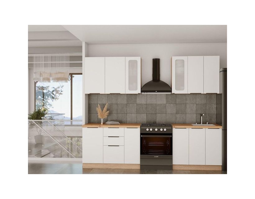| Наполнение | В комплект кухни входит фурнитура - пластиковые ручки, роликовые направляющие ящиков кухни, фирменные петли, цоколь. |