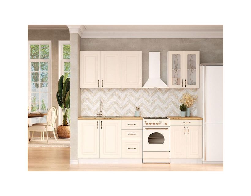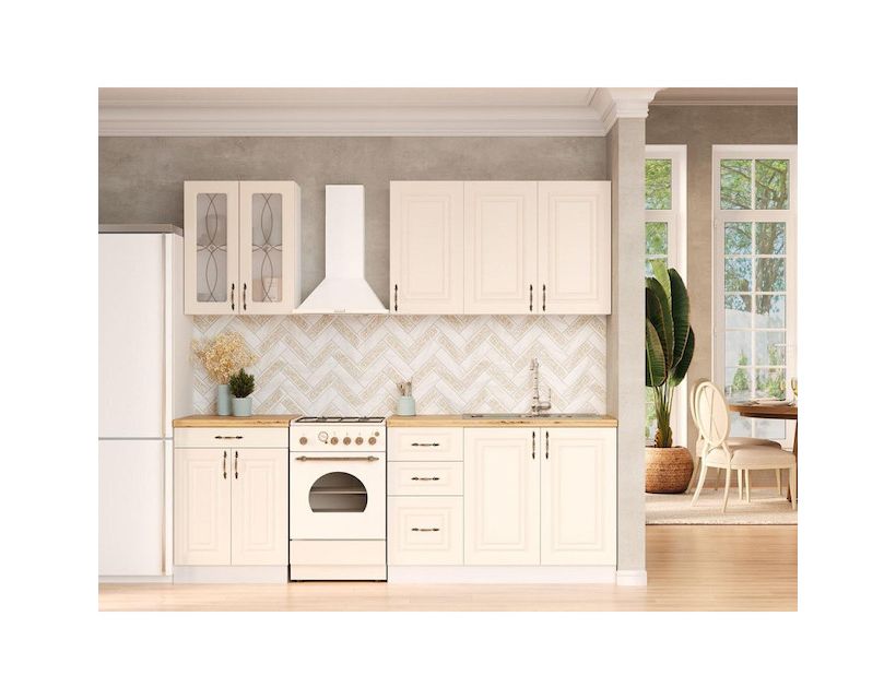 | Наполнение | В комплект кухни входит фурнитура - пластиковые ручки, роликовые направляющие ящиков кухни, фирменные петли, цоколь. |