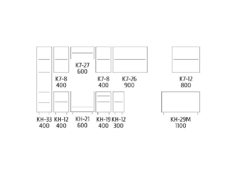 | Наполнение | В комплект кухни входит фурнитура - металлические ручки, телескопические направляющие ящиков кухни, фирменные петли, цоколь. |