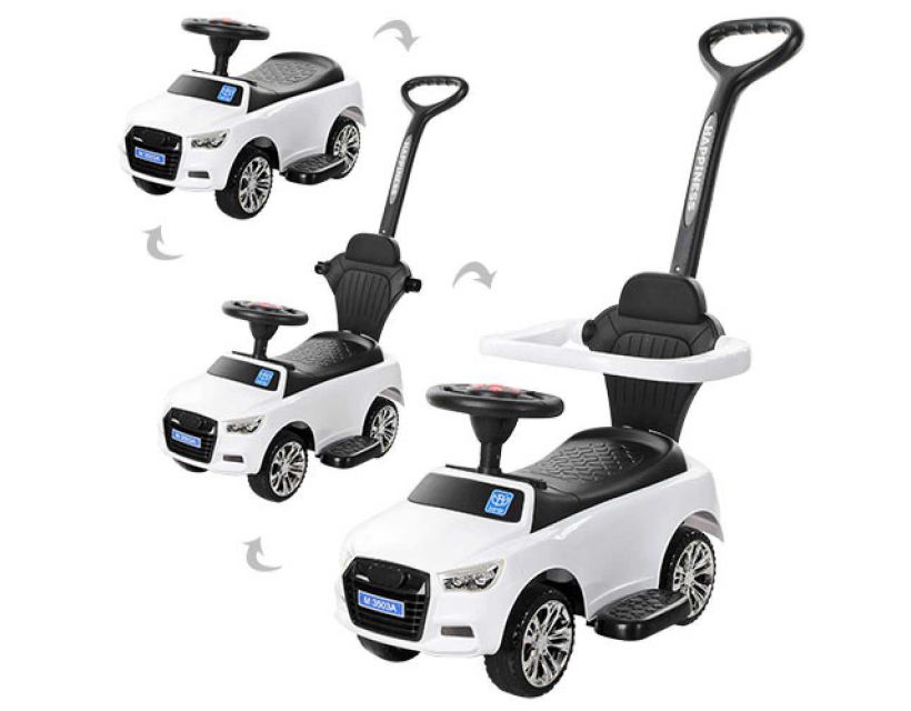 Особенности: оригинальный дизайн; родительская ручка управления; подстаканник пластиковый корпус; музыка: 6 мелодий, звук: сигнал, свет; передние фары, питание от батарей (в комплект не входят); бампер безопасности; подставки для ног; комфортное сиденье со спинкой; багажник под сиденьем Габариты: длина с родительской ручкой -89,5 см длина машины -68 см ширина машины -28 см ширина с подставками для ног -44 см высота до спинки -51 см высота до родительской ручки -90 см высота до руля -38 см высота от пола до сидения – 24 см высота от подставки для ног до сидения – 15 см размер колес: 14,5 см пластик/EVA