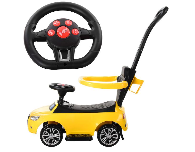 Особенности: оригинальный дизайн; родительская ручка управления; подстаканник пластиковый корпус; музыка: 6 мелодий, звук: сигнал, свет; передние фары, питание от батарей (в комплект не входят); бампер безопасности; подставки для ног; комфортное сиденье со спинкой; багажник под сиденьем Габариты: длина с родительской ручкой -89,5 см длина машины -68 см ширина машины -28 см ширина с подставками для ног -44 см высота до спинки -51 см высота до родительской ручки -90 см высота до руля -38 см высота от пола до сидения – 24 см высота от подставки для ног до сидения – 15 см размер колес: 14,5 см пластик/EVA
