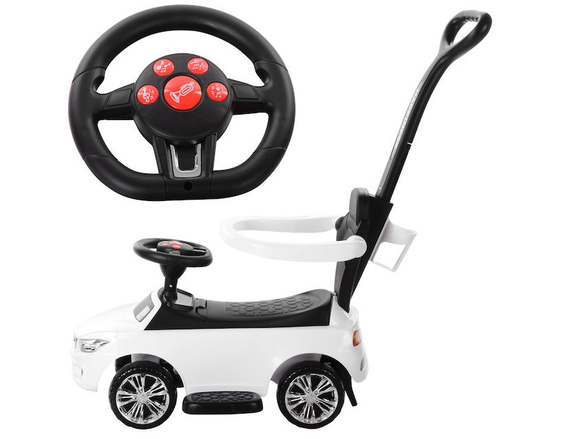 Особенности: оригинальный дизайн; родительская ручка управления; подстаканник пластиковый корпус; музыка: 6 мелодий, звук: сигнал, свет; передние фары, питание от батарей (в комплект не входят); бампер безопасности; подставки для ног; комфортное сиденье со спинкой; багажник под сиденьем Габариты: длина с родительской ручкой -89,5 см длина машины -68 см ширина машины -28 см ширина с подставками для ног -44 см высота до спинки -51 см высота до родительской ручки -90 см высота до руля -38 см высота от пола до сидения – 24 см высота от подставки для ног до сидения – 15 см размер колес: 14,5 см пластик/EVA