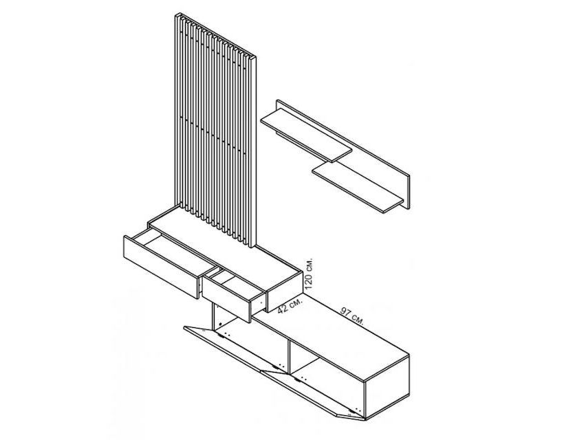 | Размер модулей | Надставка – Д-107 Г-30 В-16; Тумба под ТВ – Д-140 Г-42 В-32; Полка – Д-120 Г-18 В-26 |