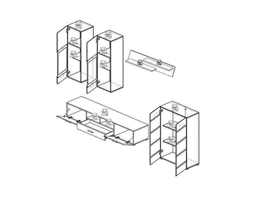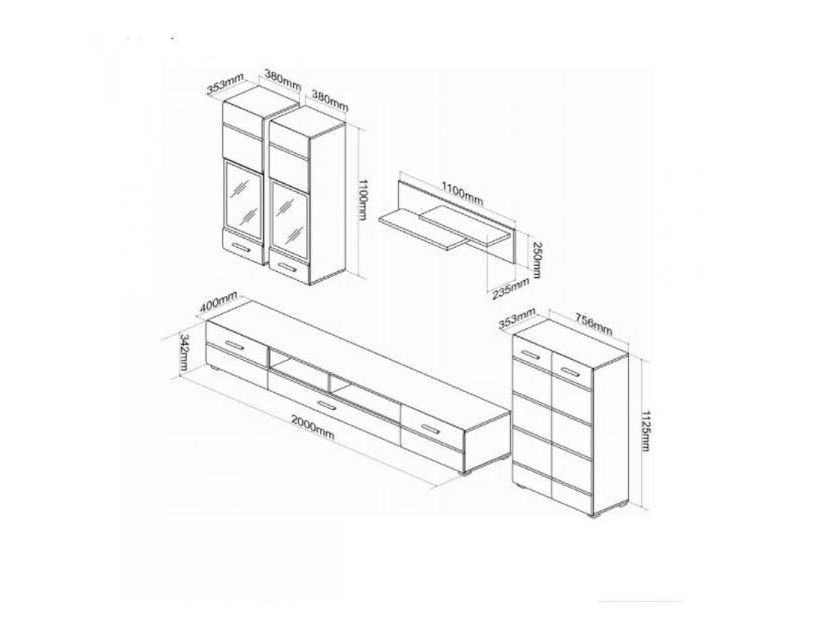 | Размер модулей | Серванты-витрины навесная Л – Д-38 Г-35 В-110; Серванты-витрины навесная П – Д-38 Г-35 В-110; Тумба – Д-76 Г-35 В-113; Тумба под ТВ – Д-200 Г-40 В-34; Полка – Д-110 Г-25 В-25 |