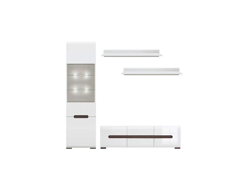 Модульна стінка для вітальні ВМК (БРВ) Ацтека N77851 Білий + Білий глянець Набір меблів у вітальню Ацтека N77851 від відомого українського виробника ВМК (БРВ) гармонійно поєднує в собі якість, функціональність та сучасний дизайн. Ці меблі ідеально впишеться в інтер'єр будь-якої вітальні, доповнивши її затишком та комфортом. Забарвлена в універсальний білий глянець колір, рама набору виконана з надійної комбінації матеріалів ДСП та МДФ, що забезпечує міцність та довговічність виробів. Прямокутна форма меблів надає їй строгості та лаконічності, а зовнішній вигляд у стилі сучасності підкреслить смак та стиль її власника. Стінка складається з модулів: Тумба під телевізор ВМК (БРВ) Ацтека RTV2D2S/4/15 N Білий + Білий глянець (GRB-1951) – 1 шт. Дводверна з двома ящиками. У кожному закритому відділенні встановлено одну полицю. Довжина: 150 см Висота: 43 см Глибина: 47 см Пенал-вітрина з підсвічуванням ВМК (БРВ) Ацтека REG1W1D/21/6 Білий + Білий глянець (GRB-1662) – 1 шт. Дводверна. За верхніми дверима зі вставкою із загартованого скла розташовані чотири полиці, у тому числі дві скляні з підсвічуванням. У нижньому відділенні встановлено одну полицю. Довжина: 60 см Висота: 210 см Глибина: 41 см Полиця настінна ВМК (БРВ) Ацтека P/2/11 Білий + Білий глянець (GRB-1649) (2 шт.) - 2 шт. Довжина: 105 см Висота: 20 см Глибина: 20 см
