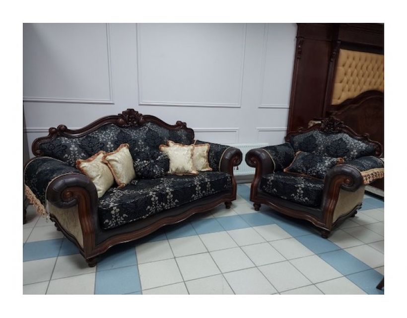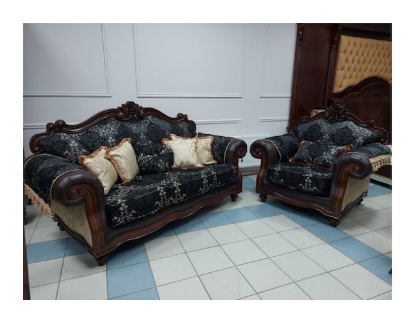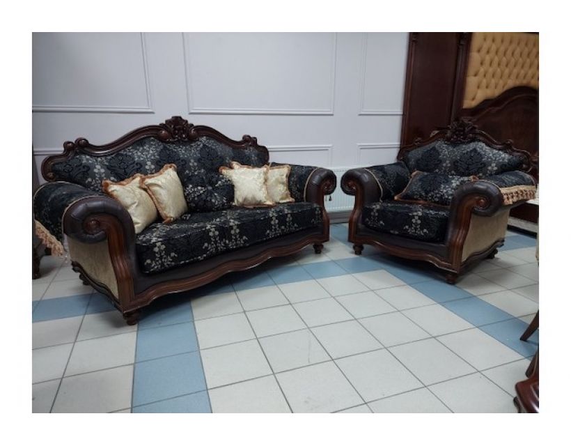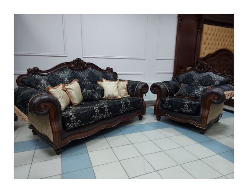 Комплект мягкой мебели "Маркиз" (каркас темный орех без патины/ткань черный жаккард серебряный узор) от Bellini порадует каждого, кому по душе классический интерьер и комфортабельность. Мягкая мебель выполнена в итальянском стиле, в универсальном белом и бежевом цветах. Диван идеально подходит для меблировки домашней гостиной в классическом итальянском стиле барокко. Комплект, состоящий из трехместного дивана и двух кресел, позволяет комфортно разместить в гостиной, столовом зале или холле до пяти гостей. Диван "Маркиз" сочетает элегантность с изысканностью. Фигурная спинка украшена богатым резным рисунком, выполненным вручную. Округлые мягкие подлокотники покрыты декоративными накидками с большими кисточками. Обивка выполнена из эко-кожи и элитной жаккардовой ткани, что привлекает внимание благодаря сложному тканевому узору. Диван укомплектован декоративными подушками с отделкой бахромой и кисточками. Кресло "Маркиз" имеет фигурную спинку. Внешняя сторона каркаса украшена богатым и сложным резным декором, который для прочности покрыт прозрачным суперстойким лаком. Мягкие округлые подлокотники дополнены декоративными накидками с отделкой кисточками. Обивка выполнена из элитной жаккардовой ткани с различными видами принта и эко-кожи, приятна на ощупь, практична, устойчива к истиранию. . Это обеспечивает долговечность и отличные эксплуатационные качества этой мебели. Пенополиуретановый наполнитель делает мягкие элементы особенно упругими.