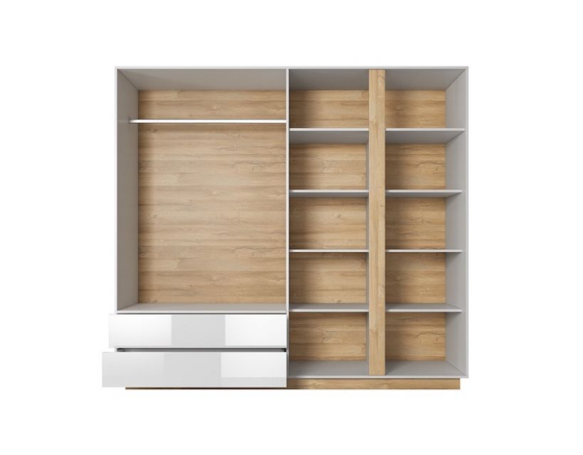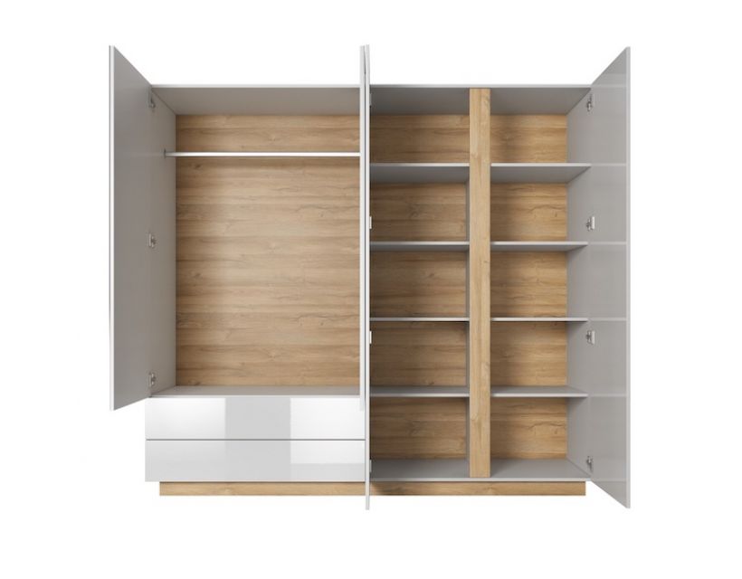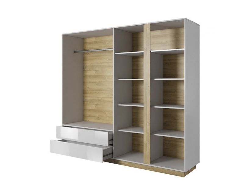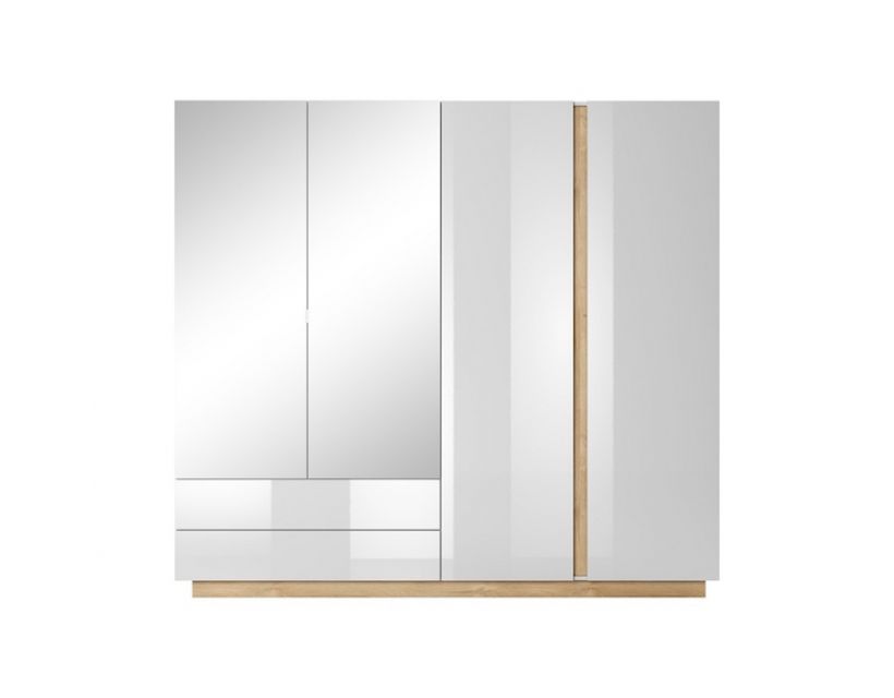 Изготовлен из высококачественных материалов, этот шкаф сочетает в себе белый глянец и дуб грандсон, что делает его стильным. Ее современный дизайн легко вписывается в разные стили оформления, а зеркало придает функциональности, позволяя быстро проверить свой образ перед выходом из дома.