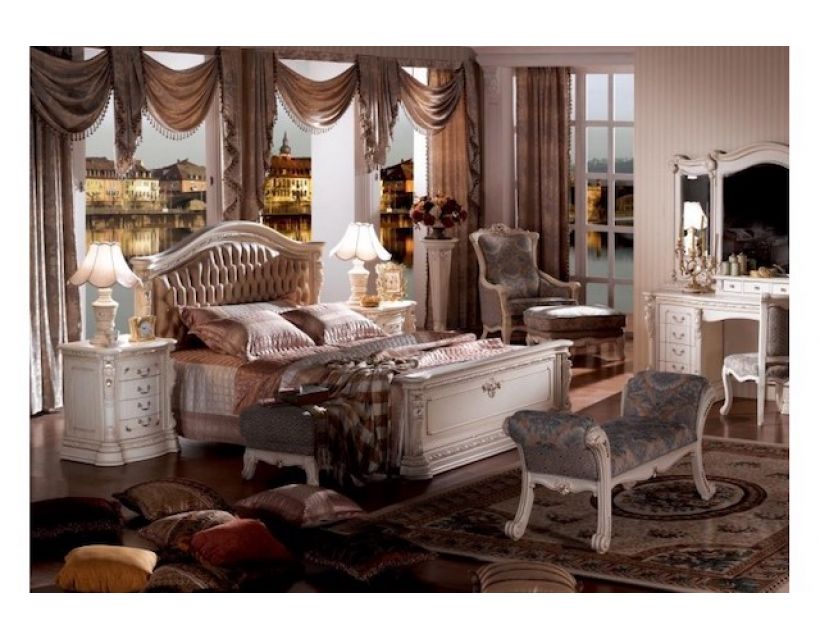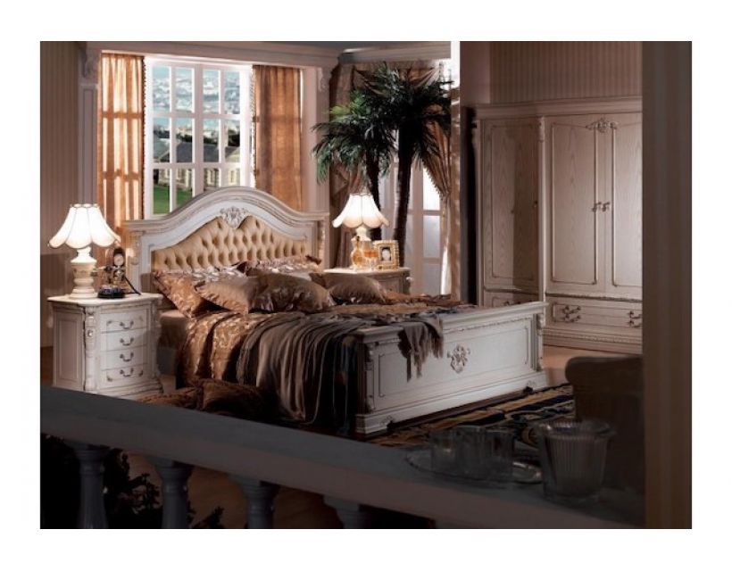 Комплект мебели для спальни изготовлен из массива натурального дерева, отделка шпоном. Цвет белый матовый с структурой дерева, декоративные элементы золота. Голова мягкая, кожа бежевого цвета, каретная стяжка "капитоне". Классический спальный гарнитур включает: Кровать двуспальная размер под матрас 180 х 200 смОртопедическая решетка под матрас с ламелямиТумба ночная 70 х 48 х 70 см (2 шт)Туалетный стол с зеркалом 179 х 53 х 94