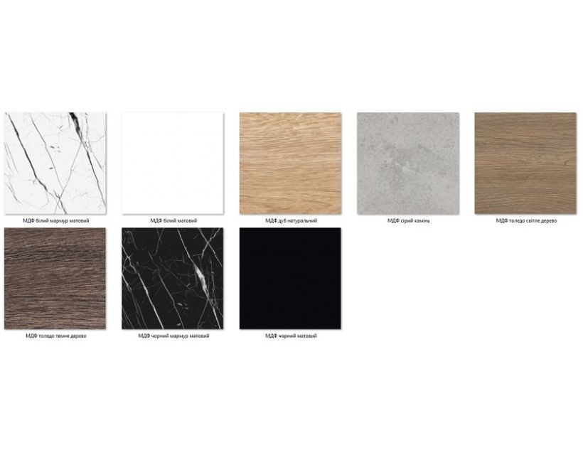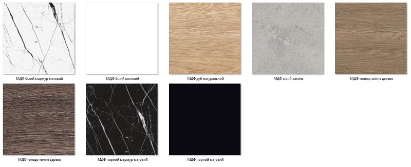 Возможные цвета столешницы: дуб натуральный матовый, толедо темное дерево, толедо светлое дерево, серый камень, черный матовый, белый матовый, мрамор черный матовый, мрамор белый матовый.