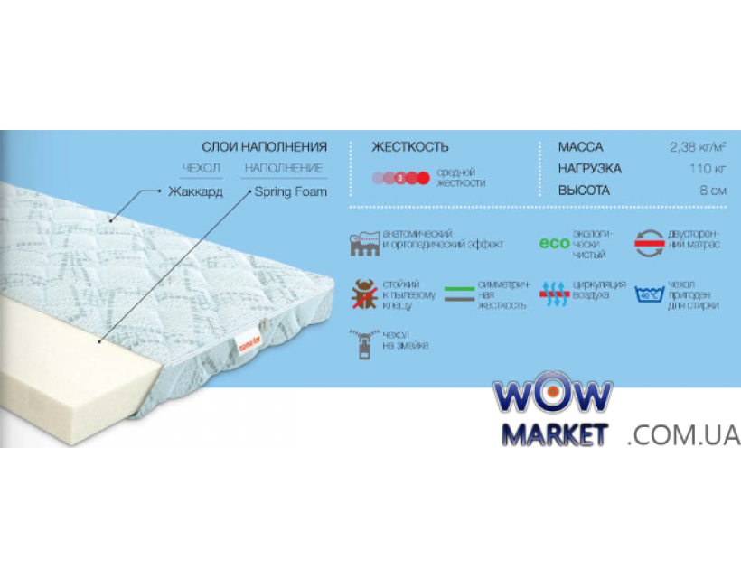 Тонкий односторонний матрас Хелп от компании Ком-Фор рекомендуемой перегрузкой до 110кг на одно спальное пространство, сотворен для увеличения удобства Вашего дивана или кровати: выравнивания плоскости, модифицирование жесткости на пригодную для Вашей спины.