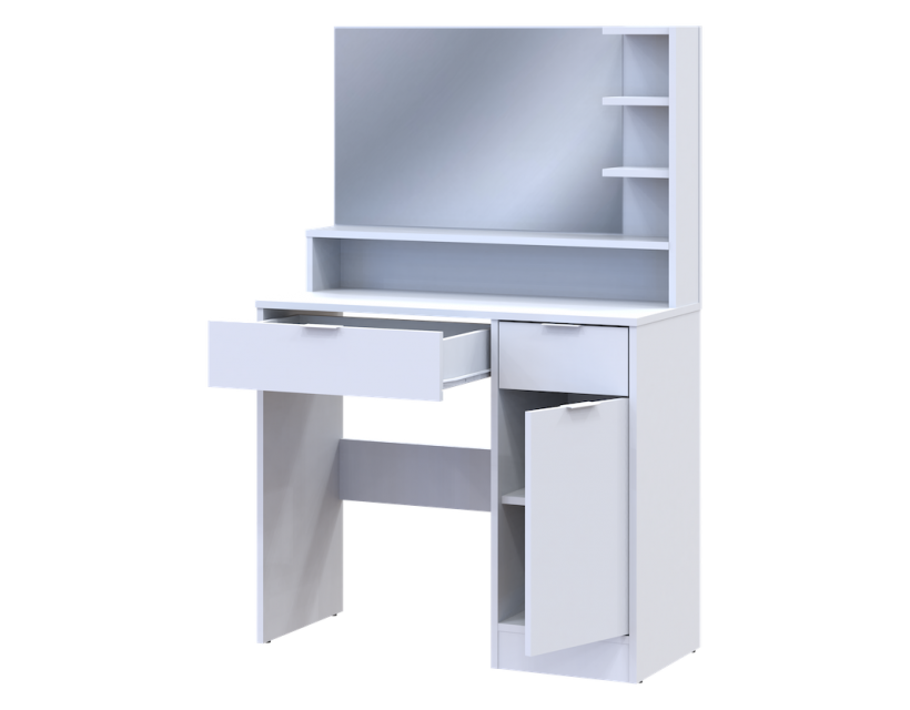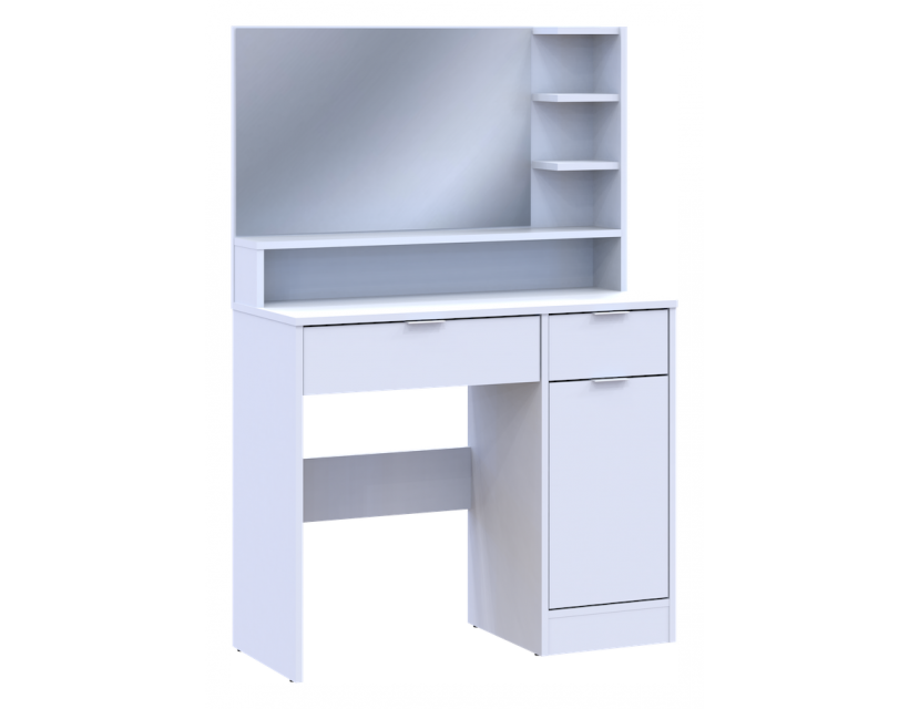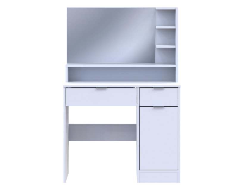 Туалетный столик изготовлен из высококачественной ламинированной ДСП от производителя Swiss Krono, что обеспечивает надежность и долговечность. Два выдвижных ящика на телескопических (шариковых) направляющих обеспечивают удобное хранение косметических средств, аксессуаров или других мелочей. Изготовленные из прочного пластика ножки придают столу стабильность и элегантный вид, что делает его отличным выбором для любого интерьера.
