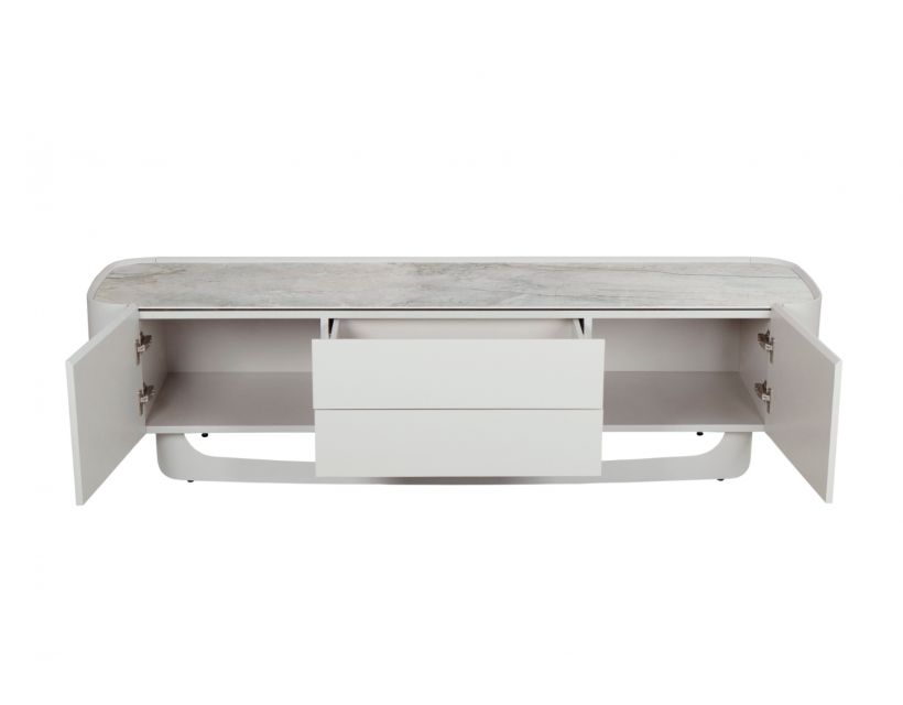 ТВ-тумба «Арно» в оттенке силвер ривер + айвори сочетает в себе современную эстетику и продуманную функциональность, создавая стильный акцент в гостиной. Столешница из матовой керамики, дополненная закалённым стеклом, передаёт природную текстуру камня: переливы серого оттенка силвер ривер придают глубину и утончённость, а светлое основание цвета айвори делает конструкцию лёгкой и визуально гармоничной.Прямоугольная форма и длина 180 см делают модель удобной для размещения телевизора, медиаустройств и декоративных элементов, одновременно поддерживая чистоту и порядок в пространстве. Металлическая рама, окрашенная в светлый тон, обеспечивает надёжность и стабильность, а лаконичный дизайн позволяет тумбе легко интегрироваться как в современный минимализм, так и в интерьеры с классическими акцентами.ТВ-тумба «Арно» — это не только практичное решение для хранения и организации, но и изысканный штрих, формирующий атмосферу уюта и стиля в вашем доме.