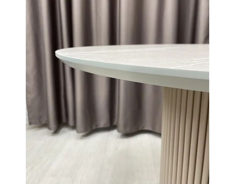 Стільниця виготовлена з інноваційного HPL-матеріалу (декор Arpa 3447 Ker) на основі МДФ товщиною 22 мм. Завдяки натуральній текстурі та матовому покриттю, стіл має елегантний вигляд і витримує щоденне користування.