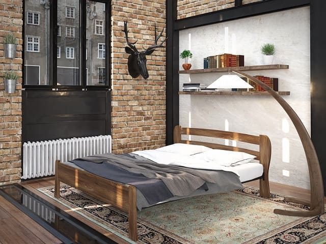 Ліжко виготовлене з поєднання прокатної сталі та натурального дерева, що забезпечує довговічність і стійкість конструкції.