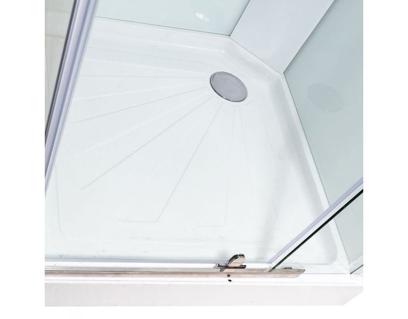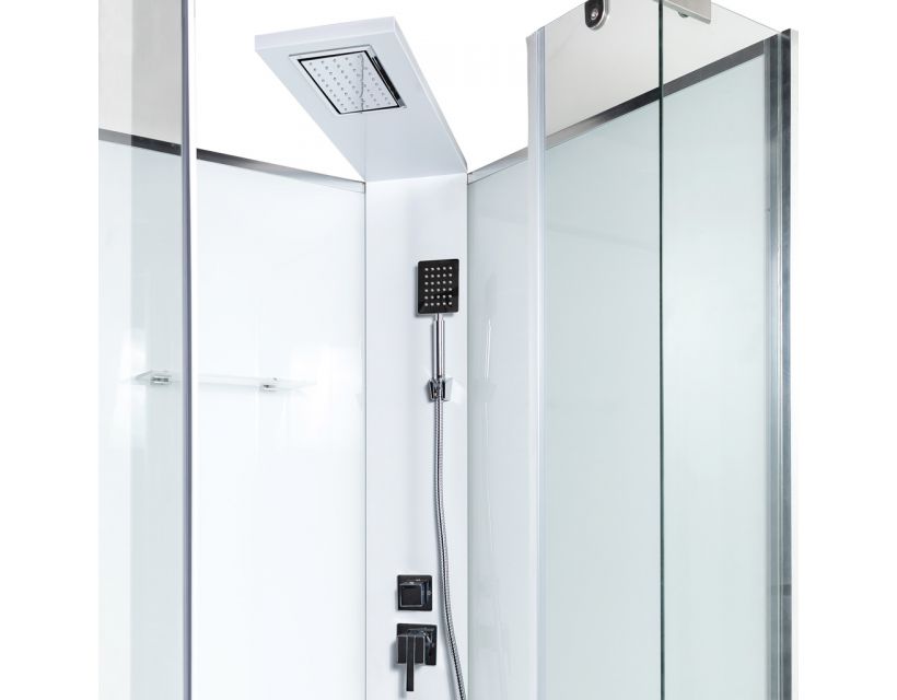 | Комплектація | алюмінієвий верхній душ з регулюванням, біла пластикова центральна панель, заднє біле скло 5 мм, квадратний ручної душ, квадратний змішувач, поличка |