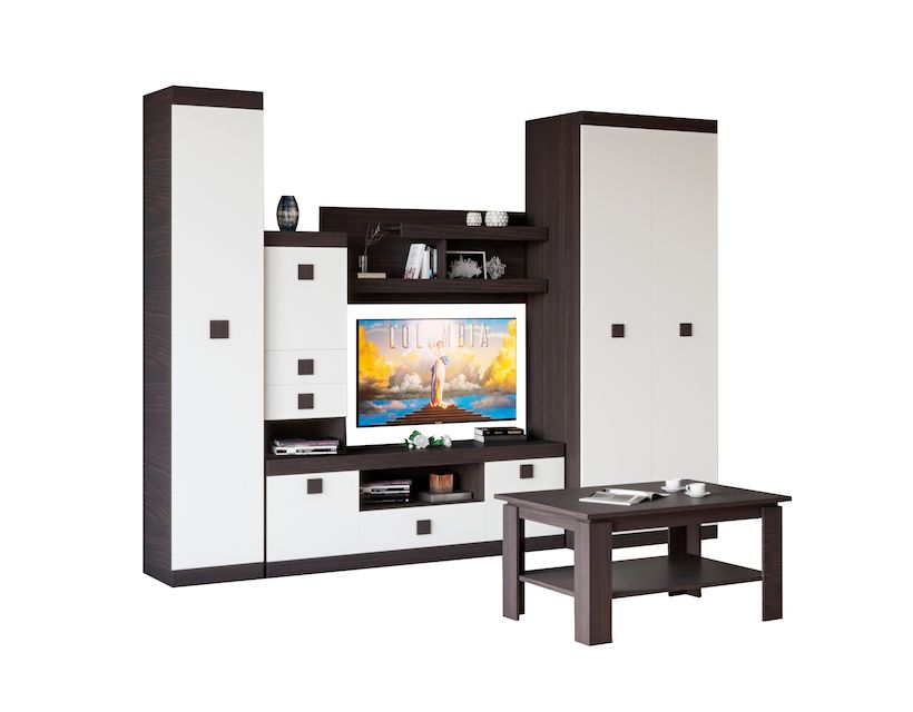 | Комплектація | пенал, тв-тумба, полиця навісна, шафа, стіл журнальний, пенал надбудова |