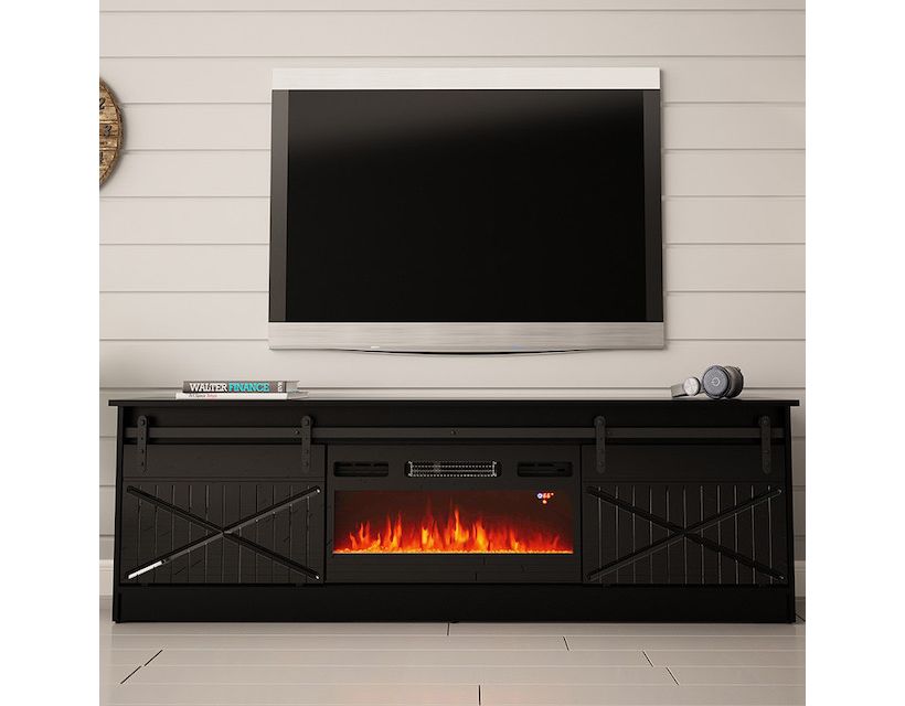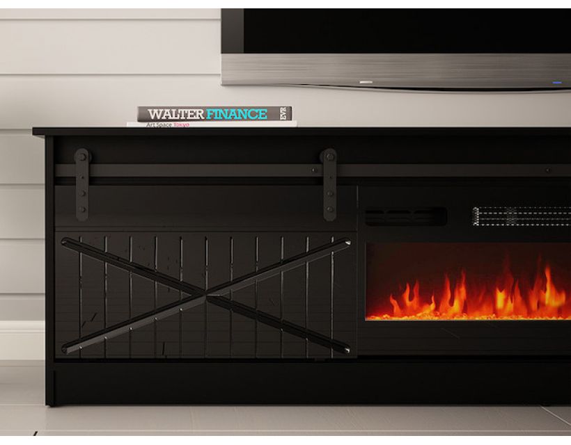Тумба ТВ із електрокаміном GRANERO CAMA MEBLE – дводверна тумба під телевізор Гранеро Кама від польської фабрики Cama Meble із фрезерованими розсувними дверима. Корпус виготовляється із ламінованої ДСП у чорному кольорі, фасад – із МДФ у чорному глянці. Для відкриття без ручок застосовується розсувна система LOFT LAGUNA, що крім основної функції виконує і декоративну роль завдяки цікавому дизайну та ефектній чорній окрасі. У кожному із двох закритих відділень встановлено по одній поліці. Електрокамін, розташований по центру, за допомогою пульта дистанційного керування змінює кольори та регулює температуру приміщення, охолоджуючи до 16°C або нагріваючи до 28°C. Пламя може бути червоним, синім або фіолетовим. Максимальне навантаження на стільницю становить 15 кг. Розміри: шир./вис./гл. – 200/56,7/35 см. Характеристики електрокаміну IF32FSB: колір: чорний; електроживлення: 220-240В/50Гц; номінальна потужність: 1400 Вт-1600 Вт.