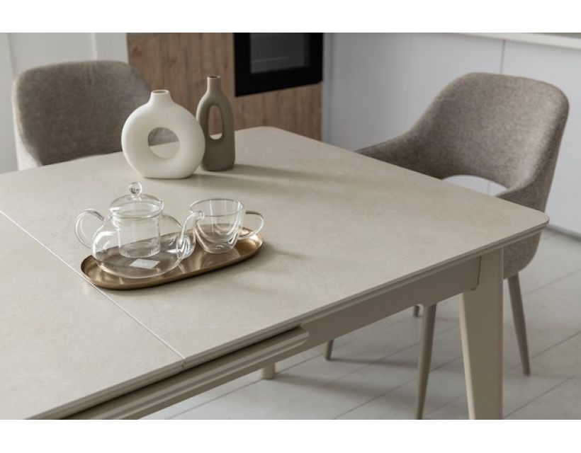 Керамічний стіл TM-125 крему шаббія + капучіно - це втілення сучасної елегантності, природної гармонії та практичності. Його матова стільниця у відтінку крему саббія нагадує теплий пісок на сонці — спокійна, благородна, з м'якою текстурою, яка надає інтер'єру витонченості та затишку. Поверхня виконана з матової кераміки та МДФ, що забезпечує стійкість до подряпин, плям та високих температур. Завдяки автоматичному механізму розкладки стіл легко збільшується з 160 до 200 см - ідеальне рішення для сімейних вечерь або зустрічей з друзями. Збалансовані пропорції та лаконічний стиль дозволяють столу гармонійно вписатися як у сучасний, так і в класичний інтер'єр. TM-125 – це не просто меблі, а центральний елемент вашої обідньої зони, що поєднує в собі красу натуральних відтінків, комфорт та надійність на кожен день.