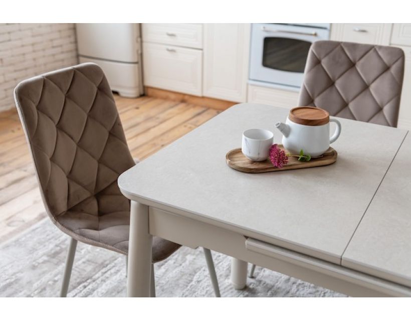 Керамічний стіл TM-92 крему шаббія + капучіно - це втілення сучасної елегантності та природного тепла. М'який відтінок крему шаббія нагадує колір піску на сонці, створюючи спокійну та гармонійну атмосферу в інтер'єрі. Матова стільниця з кераміки і МДФ не тільки виглядає вишукано, але і відрізняється високою практичністю - стійка до подряпин, плям і перепадів температур. надає конструкції стабільність і візуальне тепло, підкреслюючи природний стиль моделі. TM-92 крему шаббія + капучіно - це стіл, який однаково органічно виглядає і в сучасній кухні, і в затишній їдальні. Він поєднує естетику, комфорт та функціональність, перетворюючи кожен прийом їжі в особливий момент.