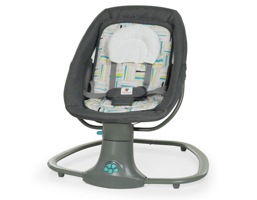 гойдалка із пластику, міцних металевих кріплень і приємного текстилю, який нагадує льон;