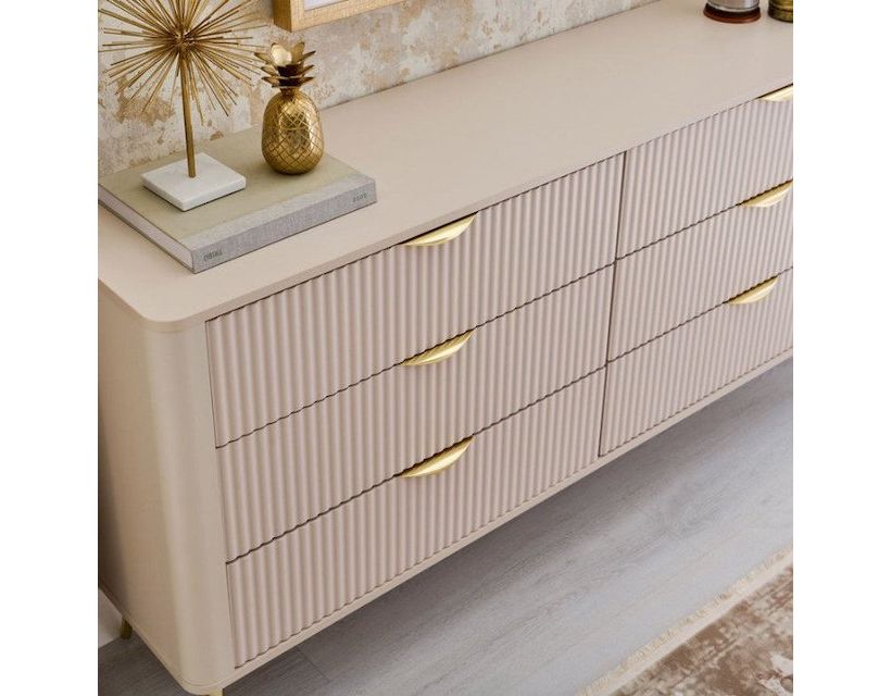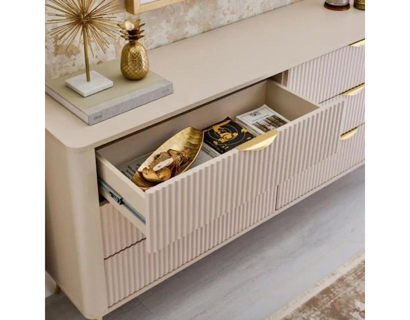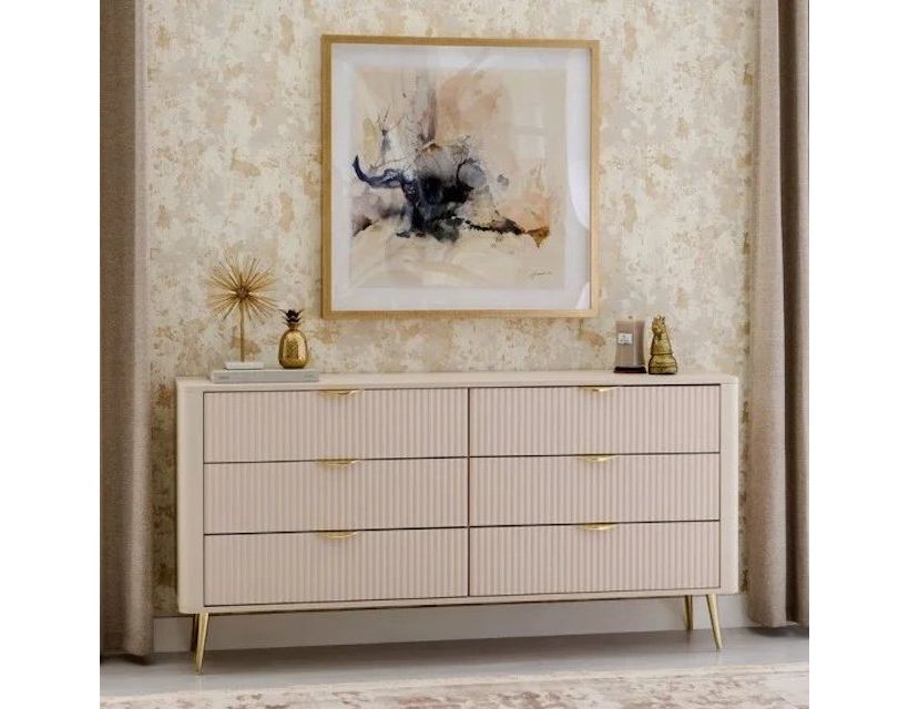 Шукаєте стильний та практичний меблевий елемент для вашого інтер'єру? Комод Perfect Home Ланте - це ідеальне рішення, що поєднує елегантний дизайн і високу функціональність. Його м'який бежевий колір легко впишеться в будь-який стиль, а золоті ніжки надають нотки розкоші, підкреслюючи ваш унікальний смак.