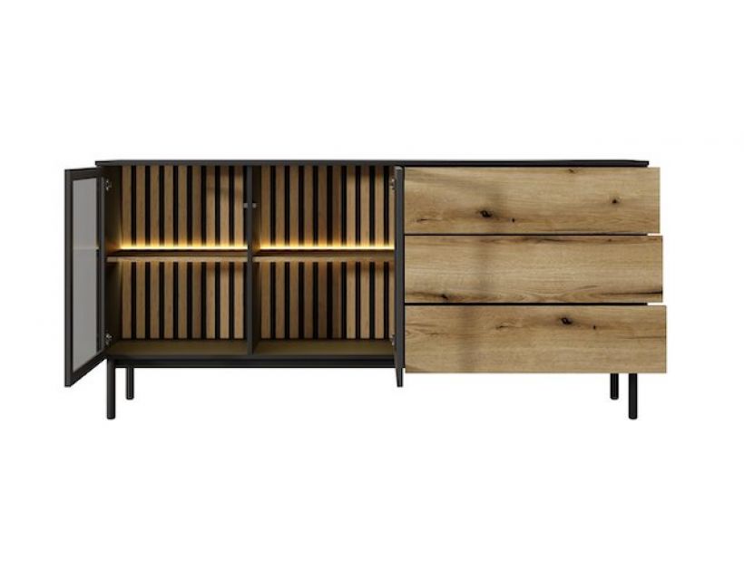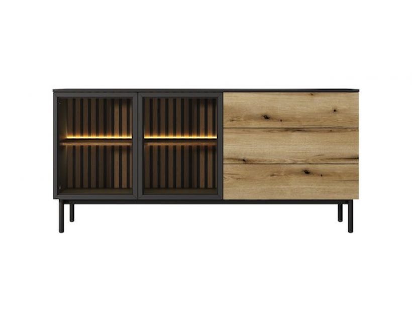 Відкрийте для себе стиль та функціональність у вашому інтер'єрі з комодом Perfect Home Ланг. Цей елегантний 2-дверний комод із трьома ящиками стане ідеальним доповненням до будь-якої кімнати, надаючи їй сучасного вигляду. Чорний корпус у поєднанні з дубом евок створює гармонійний контраст, що привертає увагу і надає затишку вашому будинку. Комод не тільки вражає своїм дизайном, але й практичністю. Завдяки просторим ящикам ви зможете зручно зберігати одяг, аксесуари та інші речі, зберігаючи порядок у вашому будинку. Додаткове підсвічування створює атмосферу затишку, підкреслюючи елегантність меблів і надаючи особливого шарму вашому інтер'єру.