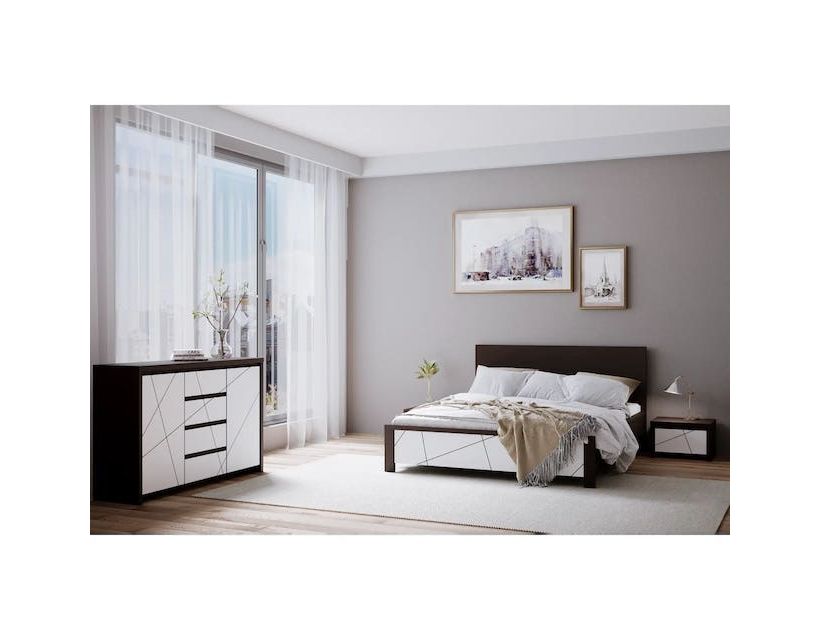 Комплект модульний до спальні ВМК (БРВ) Каспіан МДФ N77780 Венге магія + Білий сніг Витончений дизайн та висока якість відображаються в кожному виробі цього набору меблів Каспіан МДФ N77780. Основний колір - Венге магія у дивовижному дуеті з Білим снігом, виводить цей набір на новий рівень елегантності та стилю. Меблі вироблені в Україні компанією ВМК (БРВ), яка відома своїми продуктами високої якості. Як елементи корпусу, так і фасади цих меблів виготовлені з надійного ЛДСП, відомого своєю довговічністю та стійкістю до пошкоджень. При цьому врахуйте, що основа під матрац в комплект не входить і купується окремо. Природний розмір спального місця становить 160 х 200, що забезпечує затишне та комфортне перебування. В комплект входять: Тумба ліжкова ВМК (БРВ) Каспіан МДФ KOM1S Венге магія + Білий сніг (GRB-1989) - 2 шт Ліжко двоспальне (без основи під матрац) (GRB-1991) Комод у вітальню ВМК (БРВ) Каспіан МДФ KOM2D4S Венге магія + Білий сніг (GRB-1730)