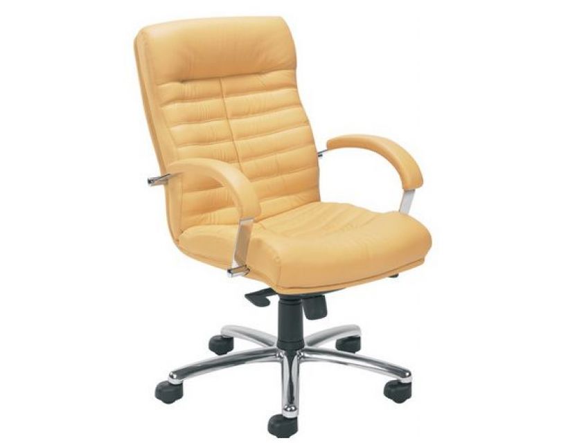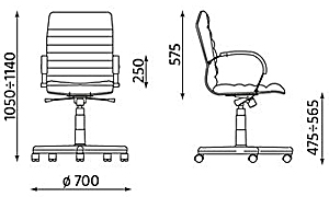 Кресло комплектуется подлокотниками, обитыми кожей и полированной алюминиевой базой. Имеет низкую спинку. Предусмотрено два вида роликов - для мягких (ковровые покрытия) и твердых (паркет, ламинат) покрытий. На нерабочих поверхностях допускается использование искусственной кожи.