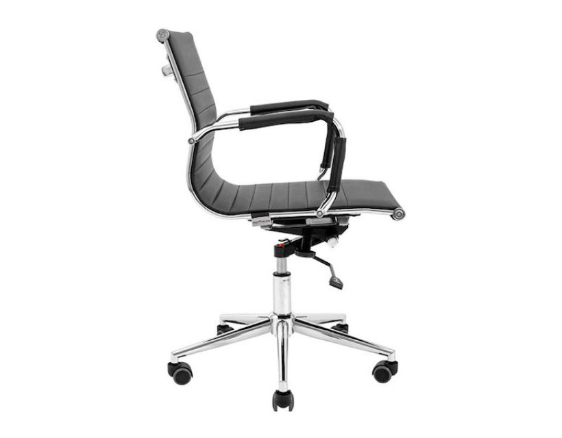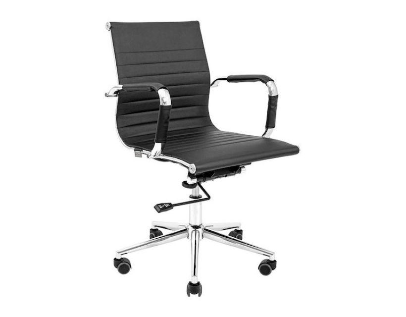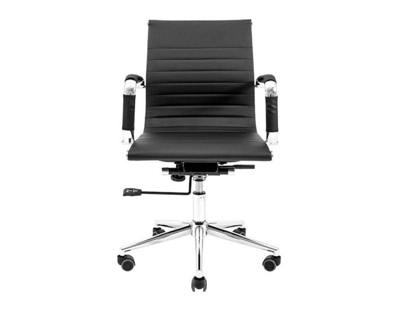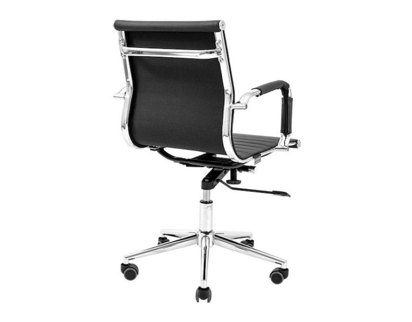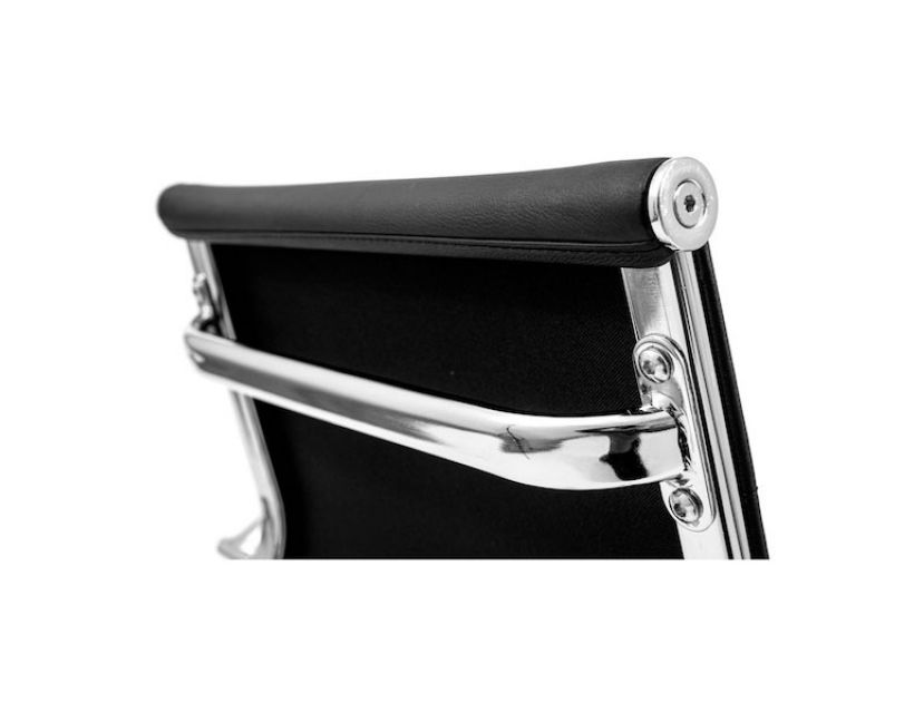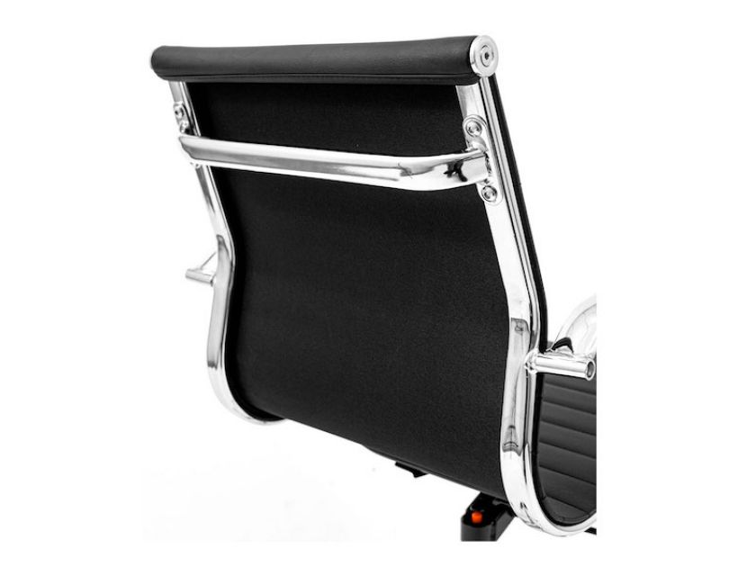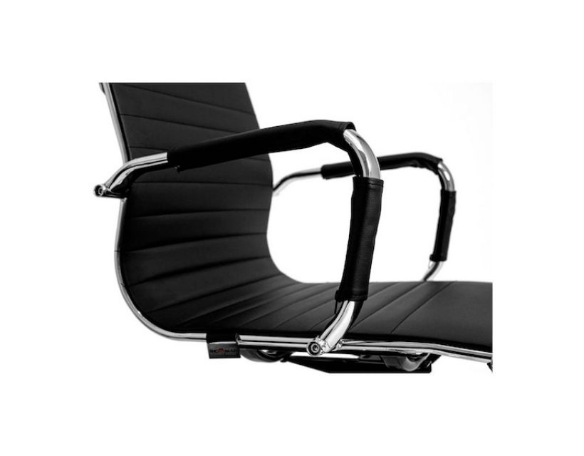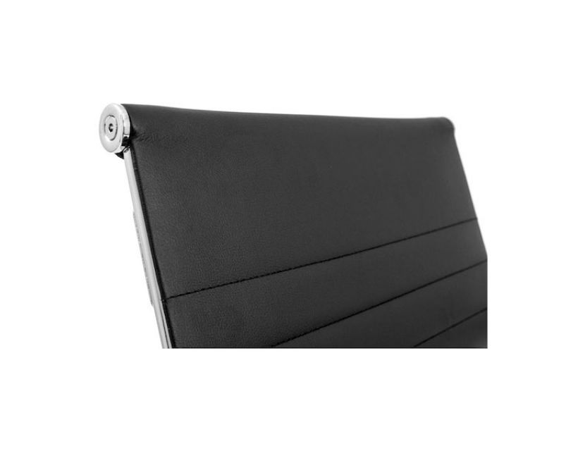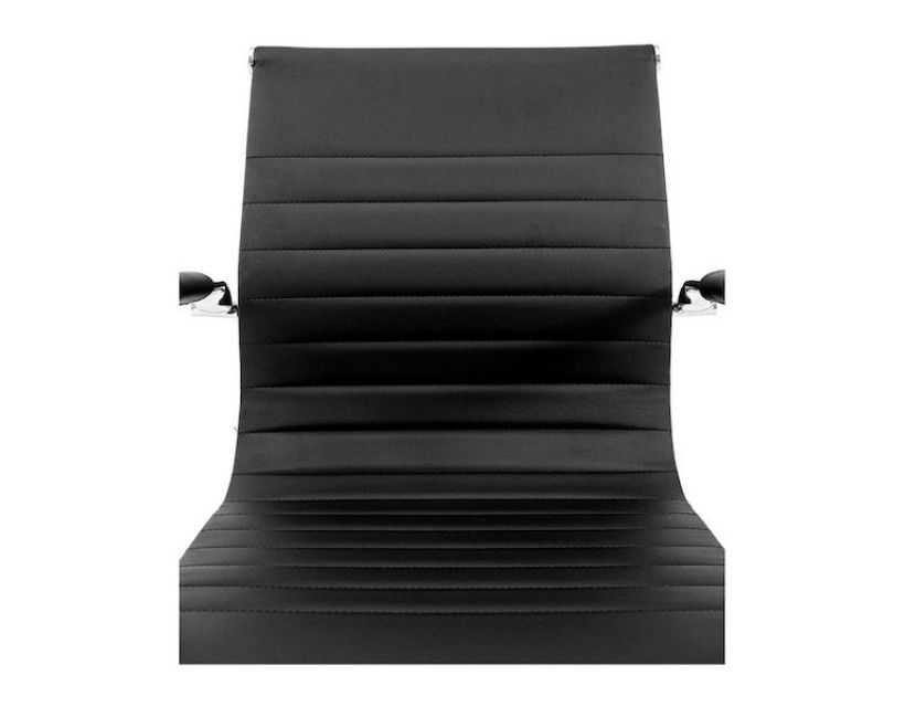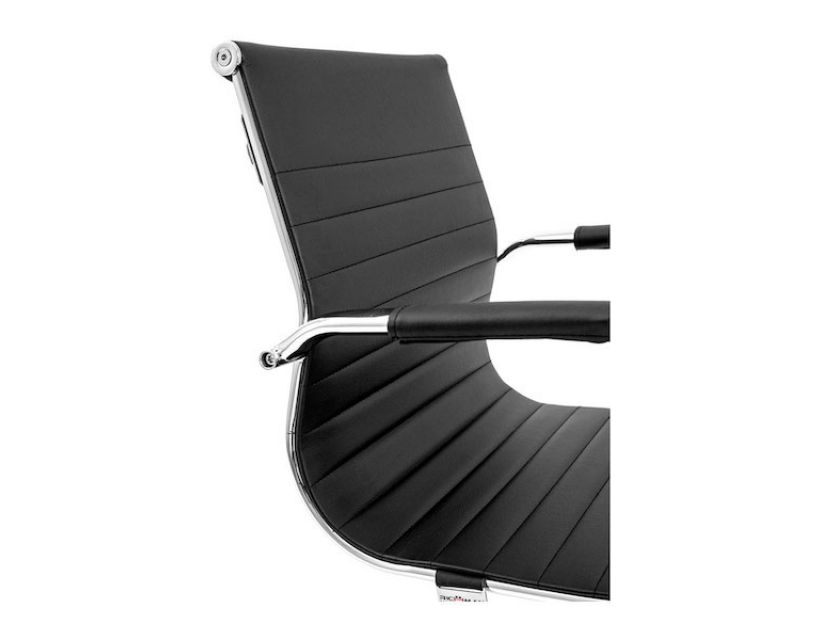 Поверхня спинки декорована горизонтальною прошивкою що надає стильного вигляду кріслу. Оббивка з високоякісної еко-шкіри чорного кольору дозволяє максимально комфортно розташовуватися в кріслі, не втомлюючись від тривалого перебування в ньому.