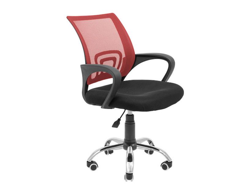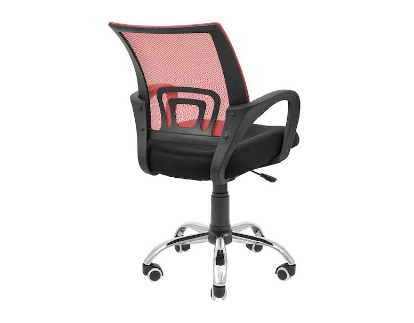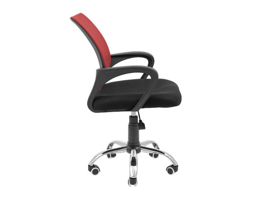 Оббивка крісла виконана з повітропроникною тканини та нейлонової сітки чорного та червоного кольору.