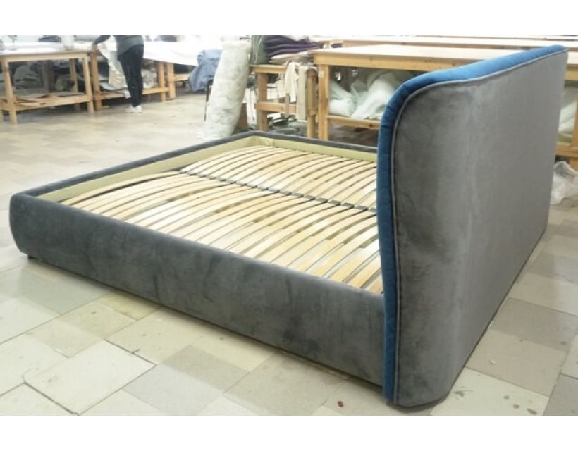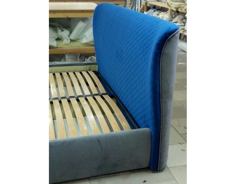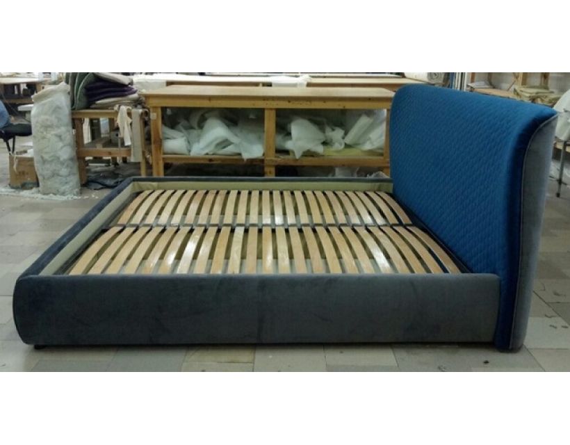 Кровать с мягкой обивкой и высоким изголовьем. В качестве основы спального места используется подъемный металлический каркас с ортопедическими буковыми ламелями (расстояние между ламелями 2,5-3см.). Каркас приподнимается вверх от изножья на 60° при помощи пневматического подъемного механизма на газовых амортизаторах, что обеспечивает доступ к объемному бельевому ящику. Подъемный механизм работает очень плавно, бесшумно и выдерживает большие нагрузки.