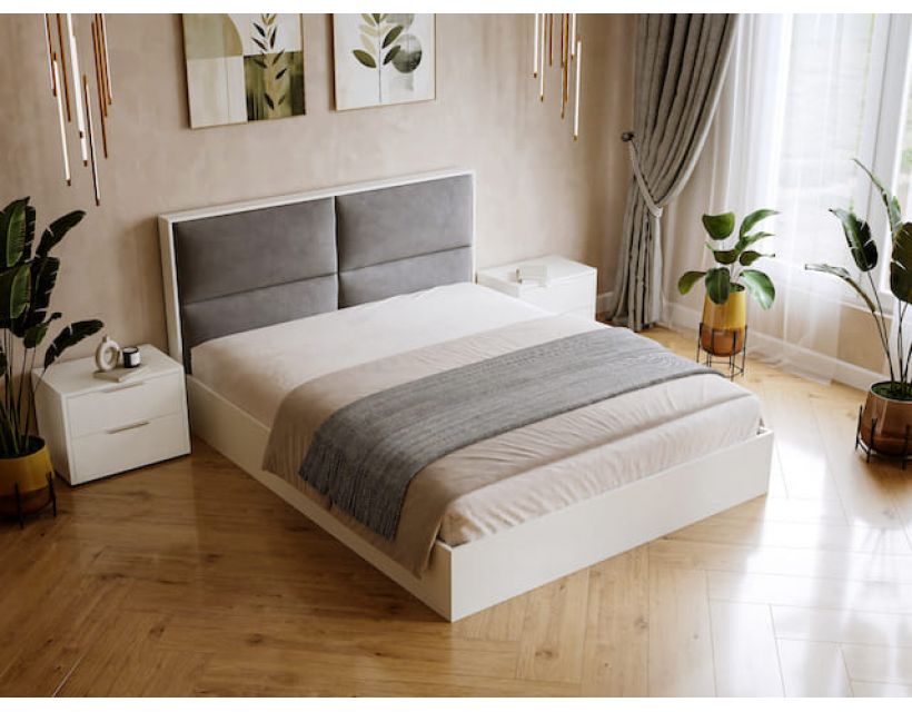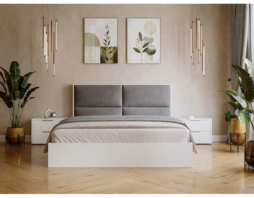 Мінімалістичний дизайн з м’яким велюровим узголів’ям у графітовому відтінку додає інтер’єру глибини й спокою. Ідеально поєднується з сучасними тумбами та декором. Суцільний дерев’яний каркас гарантує надійність, а світлий корпус візуально розширює простір.