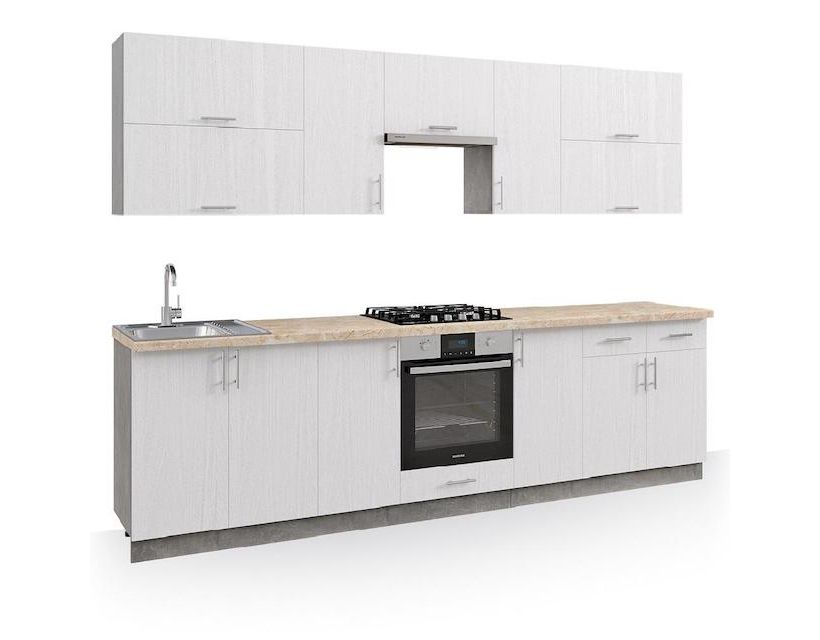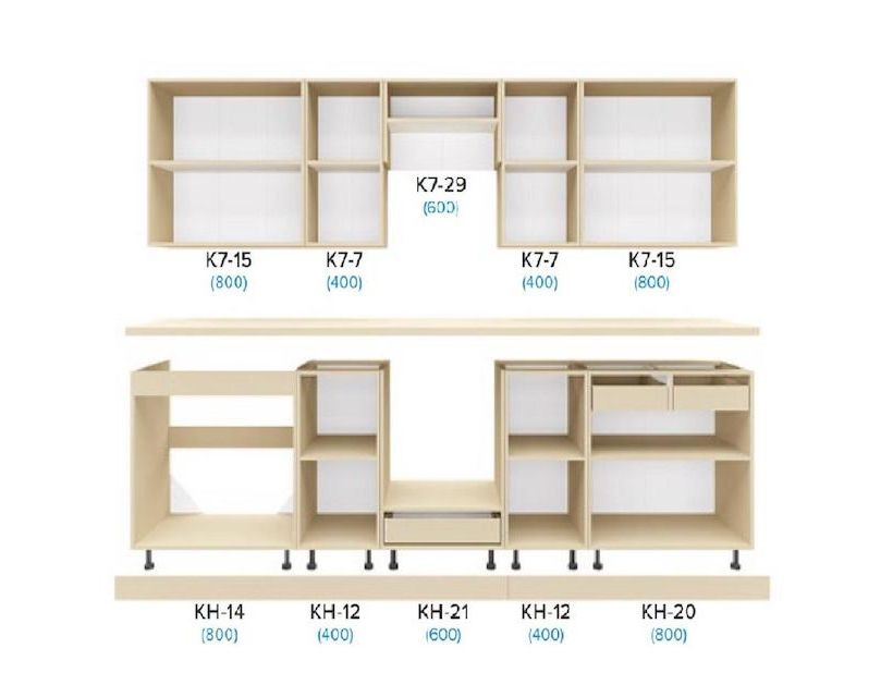 | Наполнение | У комплект кухні входить фурнітура – пластикові ручки, роликові напрямні ящиків кухні, фірмові петлі, цоколь. |