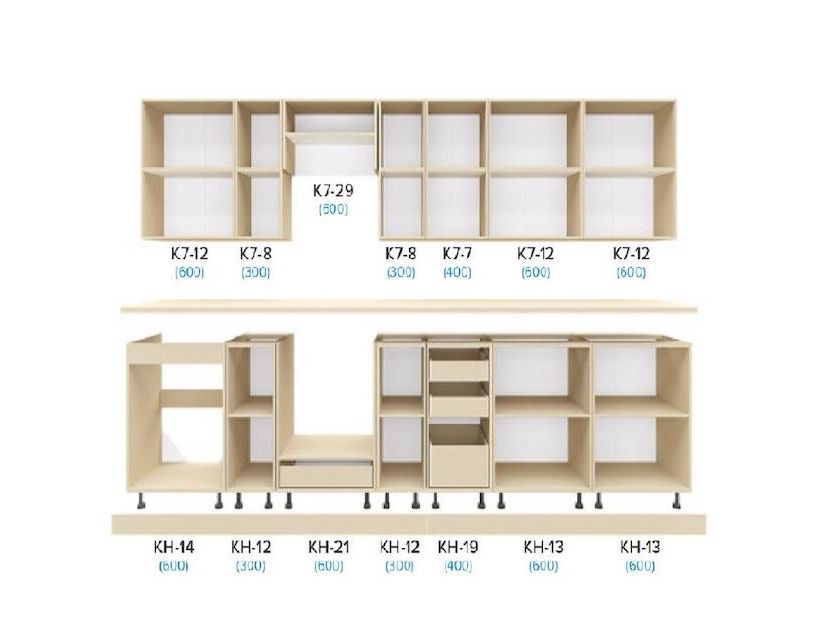 | Наполнение | У комплект кухні входить фурнітура – пластикові ручки, роликові напрямні ящиків кухні, фірмові петлі, цоколь. |