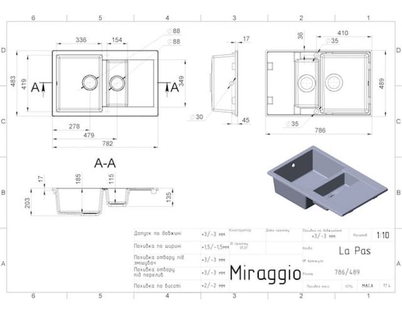 Кухонная мийка LAPAS black shine на 80% складається з кварцового піску та на 20% із поліефірної смоли, яка забезпечує міцність цього виробу. Кухонне миття витримує перепади температур від -70 до +70 ° C і не піддається впливу агресивних побутових барвників. Кухонная мийка LAPAS black shine має однорідну текстуру та колір. Вона не вбирає запахи, відштовхує жир та забруднення, а також не змінює свого кольору у процесі використання. Форма цієї моделі прямокутна, а кількість чаш - 1 основна + 1 додаткова. Тип установки – Врізний. За умови правильної експлуатації Кухонна мийка LAPAS black shine з кварцового піску прослужить багато років, не змінюючи своїх технічних характеристик і відмінного зовнішнього вигляду. MIRAGGIO – український бренд, який понад 10 років спеціалізується на виготовленні сантехніки зі штучного каменю. Кожен виріб – це неповторний шедевр, над яким працювала команда дизайнерів та технологів. Кожна дрібниця ретельно продумана, адже філософією бренду є дизайн та виробництво витонченої та одночасно практичної у повсякденному житті сантехніки. Компанія має власне виробництво, яке розташоване у місті Дніпро, Україна. Кухонні мийки MIRAGGIO комплектуються сифонами італійського виробництва та кріпленнями для фіксації миття. На всі моделі діє гарантія 10 років від виробника.