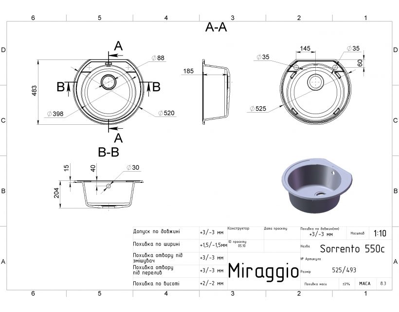Кухонная мийка TULUZA gray на 80% складається з кварцового піску та на 20% із поліефірної смоли, яка забезпечує міцність цього виробу. Кухонне миття витримує перепади температур від -70 до +70 ° C і не піддається впливу агресивних побутових барвників. Кухонная мийка TULUZA gray має однорідну текстуру та колір. Вона не вбирає запахи, відштовхує жир та забруднення, а також не змінює свого кольору у процесі використання. Форма цієї моделі Кругла, а кількість чаш – 1. Тип установки – Врізний. За умови правильної експлуатації Кухонна мийка TULUZA gray з кварцового піску прослужить багато років, не змінюючи своїх технічних характеристик і відмінного зовнішнього вигляду. MIRAGGIO – український бренд, який понад 10 років спеціалізується на виготовленні сантехніки зі штучного каменю. Кожен виріб – це неповторний шедевр, над яким працювала команда дизайнерів та технологів. Кожна дрібниця ретельно продумана, адже філософією бренду є дизайн та виробництво витонченої та одночасно практичної у повсякденному житті сантехніки. Компанія має власне виробництво, яке розташоване у місті Дніпро, Україна. Кухонні мийки MIRAGGIO комплектуються сифонами італійського виробництва та кріпленнями для фіксації миття. На всі моделі діє гарантія 10 років від виробника.