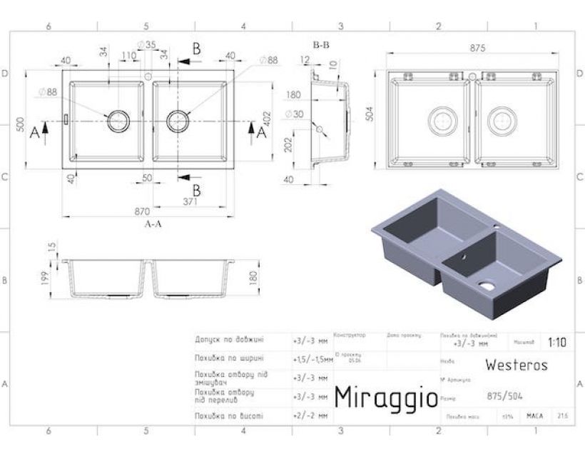 Кухонне миття WESTEROS black shine на 80% складається з кварцового піску і на 20% з поліефірної смоли, яка забезпечує міцність цього виробу. Кухонне миття витримує перепади температур від -70 до +70 ° C і не піддається впливу агресивних побутових барвників. Кухонная мийка WESTEROS black shine має однорідну текстуру та колір. Вона не вбирає запахи, відштовхує жир та забруднення, а також не змінює свого кольору у процесі використання. Форма цієї моделі прямокутна, а кількість чаш - 1 основна + 1 додаткова. Тип установки – Врізний. За умови правильної експлуатації Кухонна мийка WESTEROS black shine з кварцового піску прослужить багато років, не змінюючи своїх технічних характеристик і відмінного зовнішнього вигляду. MIRAGGIO – український бренд, який понад 10 років спеціалізується на виготовленні сантехніки зі штучного каменю. Кожен виріб – це неповторний шедевр, над яким працювала команда дизайнерів та технологів. Кожна дрібниця ретельно продумана, адже філософією бренду є дизайн та виробництво витонченої та одночасно практичної у повсякденному житті сантехніки. Компанія має власне виробництво, яке розташоване у місті Дніпро, Україна. Кухонні мийки MIRAGGIO комплектуються сифонами італійського виробництва та кріпленнями для фіксації миття. На всі моделі діє гарантія 10 років від виробника.
