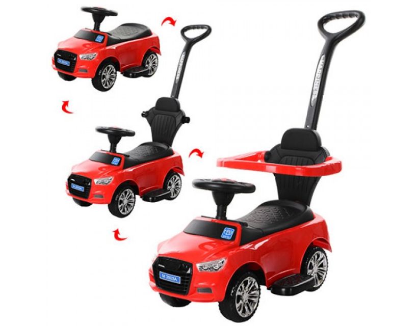 Особенности: оригинальный дизайн; родительская ручка управления; подстаканник пластиковый корпус; музыка: 6 мелодий, звук: сигнал, свет; передние фары, питание от батарей (в комплект не входят); бампер безопасности; подставки для ног; комфортное сиденье со спинкой; багажник под сиденьем Габариты: длина с родительской ручкой -89,5 см длина машины -68 см ширина машины -28 см ширина с подставками для ног -44 см высота до спинки -51 см высота до родительской ручки -90 см высота до руля -38 см высота от пола до сидения – 24 см высота от подставки для ног до сидения – 15 см размер колес: 14,5 см пластик/EVA