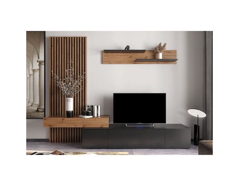 Модульна стінка для вітальні Гербор Ребека плюс Дуб Артізан/Чорний Унікальна та стильна вітальня "Ребека плюс" кольору "Дуб артизан/чорний" - ідеальне рішення для сучасних та стильних інтер'єрів. Виготовлена українським виробником Gerbor, ця меблева стінка відрізняється своїм мінімалістичним дизайном та якістю матеріалів. Її загальні розміри: довжина – 250 см, глибина – 42 см, висота – 200 см – дозволяють їй ідеально вписатися у простір більшості віталень кімнат. Корпус та фасад виконані з якісної ЛДСП, що гарантує довгу службу та збереження зовнішнього вигляду меблів. Характеристики: Надставка: Довжина – 107 см, Глибина – 30 см, Висота – 16 см; Тумба під ТВ: Довжина – 180 см, Глибина – 42 см, Висота – 32 см; Полиця: Довжина - 140 см, Глибина - 18 см, Висота - 26 см. Вітальня "Ребека плюс" оснащена напрямними кульками повного висування HAFELE від виробника з Німеччини, що забезпечує плавність та комфорт при відкритті та закритті ящиків. А навісні петлі SLIDE-ON від компанії Hettich також з Німеччини забезпечують безпеку та зносостійкість при щоденній експлуатації. Система ручок "Push-to-Open" додає сучасне та стильне рішення у дизайн продукту, спрощуючи доступ до вмісту стінки.