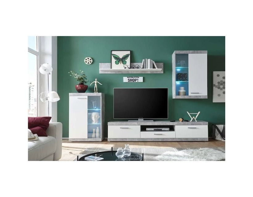 Модульна стінка для вітальні ВМК (БРВ) Кетлін Бетон + Німфея альба Стінка для вітальні ВМК (БРВ) Кетлін Бетон + Німфея альба виконана в сучасному стилі і має колірне рішення "Бетон/німфея альба". Ця меблева стінка гармонійно виглядатиме в будь-якому інтер'єрі завдяки своєму нейтральному кольору. Меблі виготовлені з якісних матеріалів ЛДСП/ДСП/МДФ, що гарантує збереження та довговічність меблевих виробів. Розміри загальні: Довжина – 255 см; Глибина – 40 см; Висота – 190 см. Стінка складається з модулів: Вітрина REG1W – 1 шт. Одні двері зі скляною вставкою. Довжина: 60 см Висота: 100,6 см Глибина: 35,4 см Тумба ТБ RTV2K1S - 1 шт. Одне відкрите відділення, два відкидні двері, один ящик, максимальне навантаження на стільницю 40 кг. Довжина: 185 см Висота: 39,5 см Глибина: 40 см Вітрина навісна SFW1WP – 1 шт. Одні двері зі скляною вставкою, усередині – дві скляні полиці. Довжина: 60 см Висота: 100 см Глибина: 35,4 см Полиця POL130 - 1 шт. Максимальне навантаження – 5 кг. Довжина: 130 см Висота: 24 см Глибина: 22 см Для освітлення меблі передбачено LED підсвічування, розташоване у вітрині.