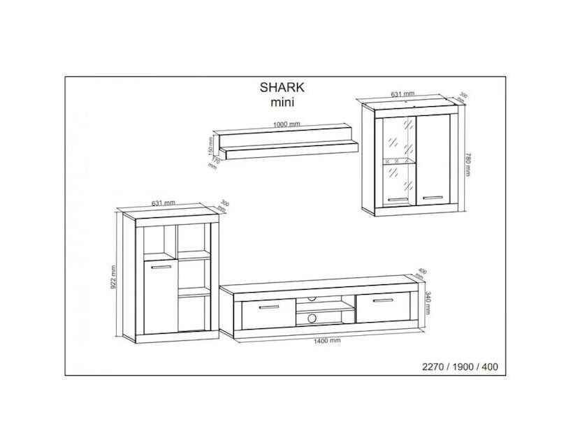 Стелаж – Д-63 Г-30 В-93; Серванти-вітрини навісна - Д-63 Г-40 В-78; Тумба під ТВ – Д-140 Г-40 В-34; Полиця - Д-100 Г-17 В-15 |